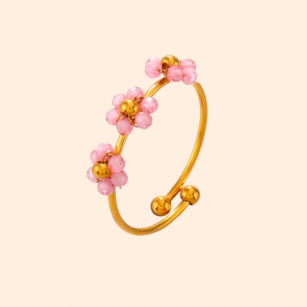 - Detalles: Aro abierto ajustable con flores de cuentas rosadas y centro dorado