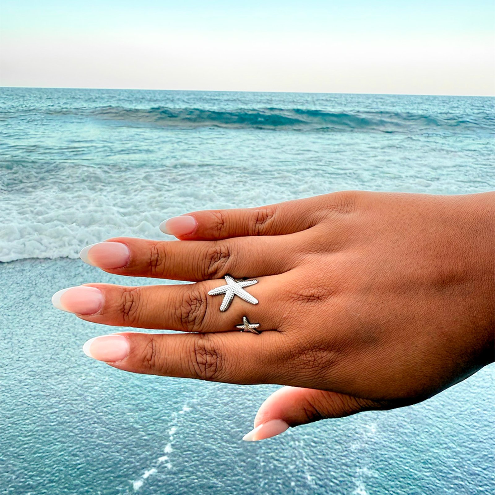- Detalles: Anillo abierto con dos estrellas de mar en distintos tamaños, con textura realista. Ajustable.