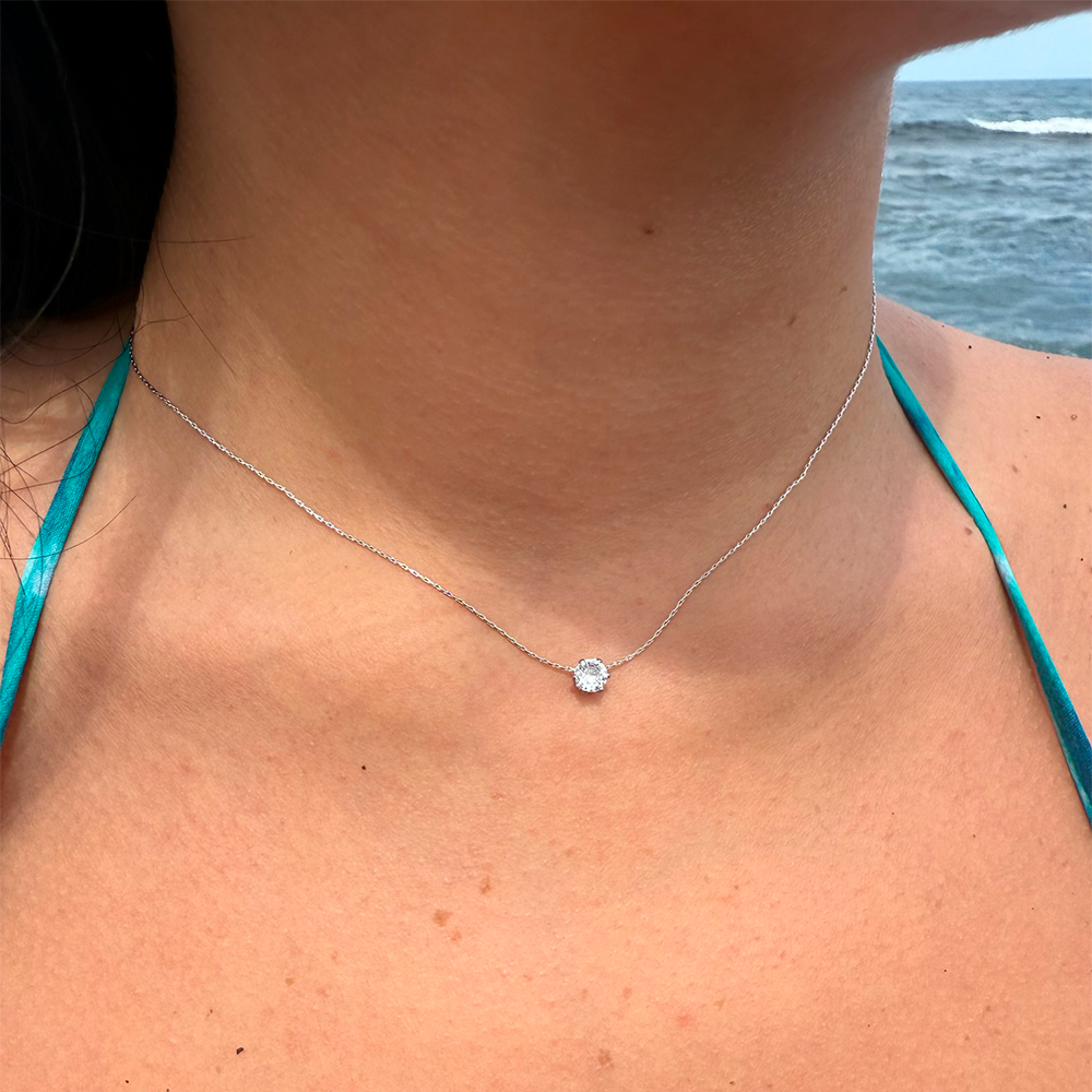 • Detalles: Cadena fina de 0.5 mm con colgante de circonita de 5.5 mm. Largo total: 38.5 cm + 5 cm de extensión
