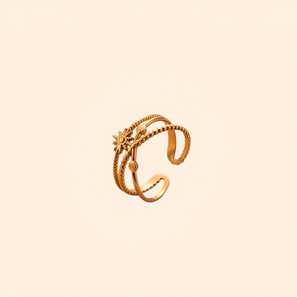 - Detalles: Doble banda con textura de cuentas y detalle solar en el centro