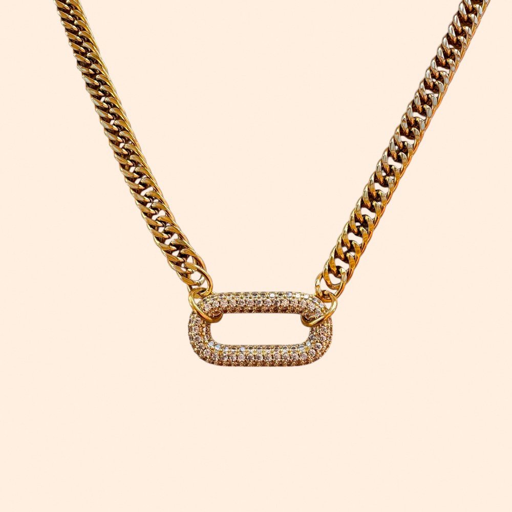 - Detalles: Cadena doble tipo cubana con eslabón frontal adornado con circonitas
